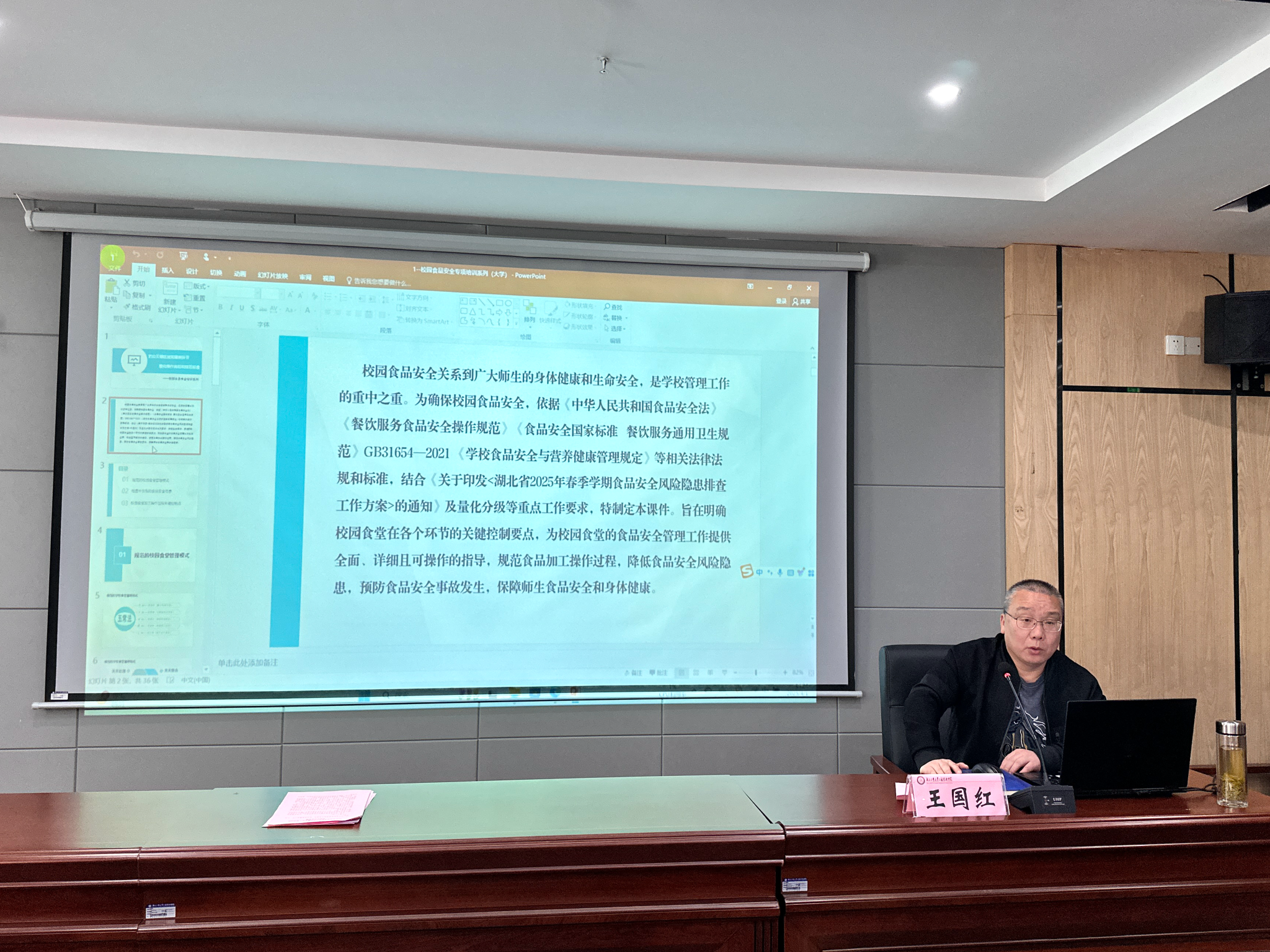 4月1日下午,学院食品安全管理体系建设项目暨从业人员职业能力认证培训开班仪式在南教学区综合楼202会议室举行。本次活动由后勤保障部主办,旨在通过政校联动,筑牢校园食品安全防线,守护师生“舌尖安全”。洪山区市场监督管理局执法大队队长王国红、狮子山市场监督管理所所长吴轶人应邀参加开班仪式,院长张业鹏、副院长查纯出席活动,学院百余名食堂管理人员及从业代表参会。
