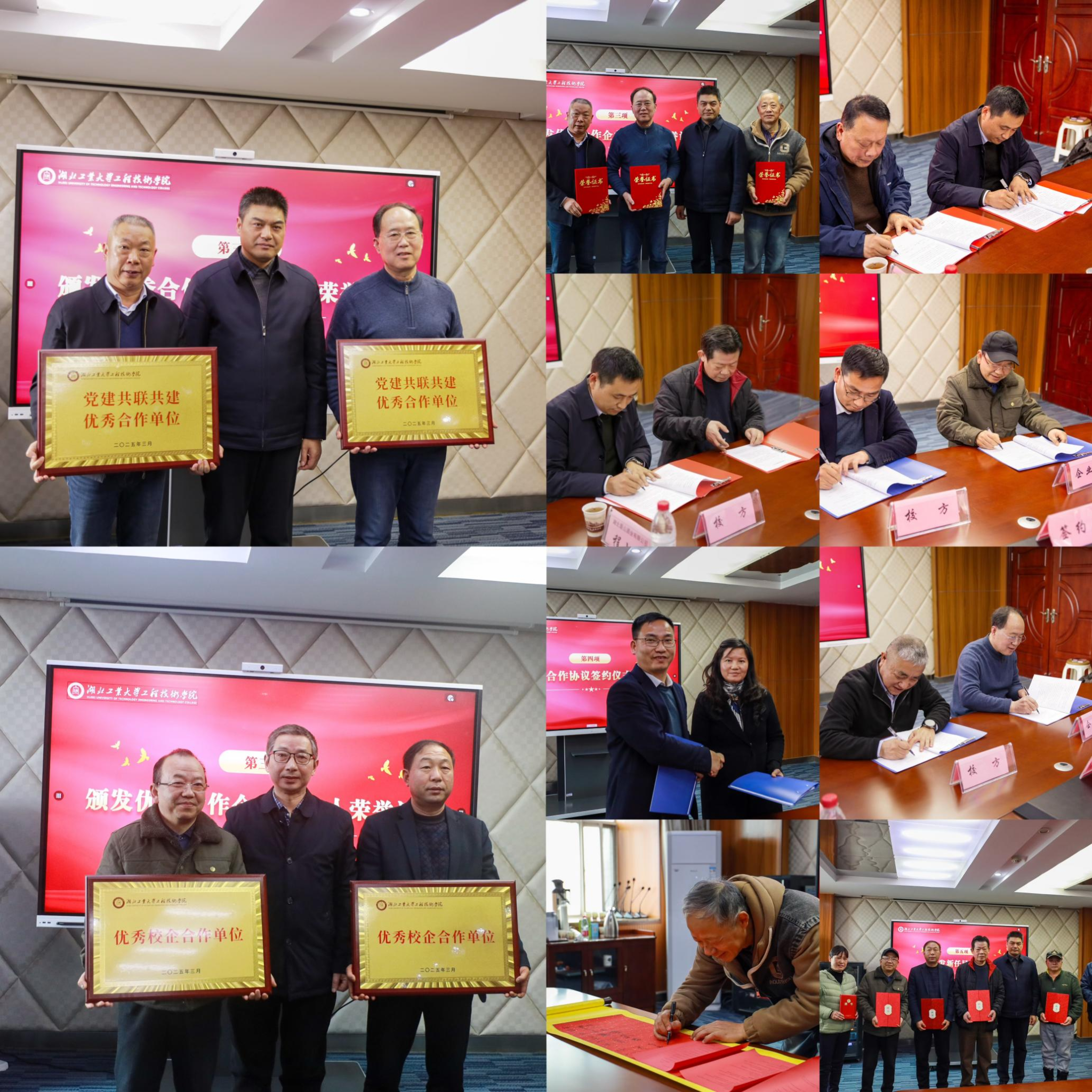 会上,学院党委书记朱爱军、院长张业鹏分别为武汉食品工业协会、黄鹤楼酒业有限公司颁发了党建共联共建优秀合作单位奖牌,为湖北聂山酒业有限公司、湖北清鲟生物科技有限公司颁发优秀校企合作单位奖牌,为多位对聘任学院兼职思政导师、就业导师做出突出贡献的企业家颁发荣誉证书。随后与多家企业签署党建共联共建、实习基地协议、产学研合作协议等,并发起校企合作倡议,邀请全体与会企业集体签署《产学研战略合作倡议书》。
