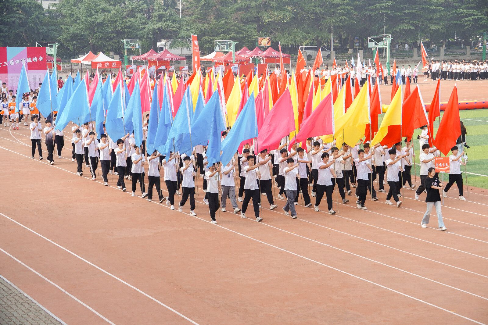 本届运动会共设学生组与教工组两大类,涵盖了9项径赛、5项田赛以及6项趣味团体项目。来自全院11个教工组和9系学生组近2000名运动员同场竞技,在20余项个人赛和10余项团体赛中展开角逐,充分展现竞技体育与团队协作的融合魅力。