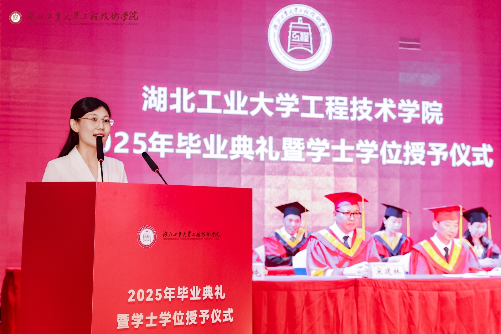 巡司河畔,骊歌悠扬。6月10日上午,湖北工业大学工程技术学院2025年毕业典礼暨学士学位授予仪式在学校中区大礼堂隆重举行。湖北工业大学党委副书记胡晓艳为优秀毕业生代表颁奖。学院领导朱爱军、张业鹏、曹仲伟、宋建林、孟涛、查纯、姜伟等出席典礼。学院党委副书记曹仲伟主持典礼。