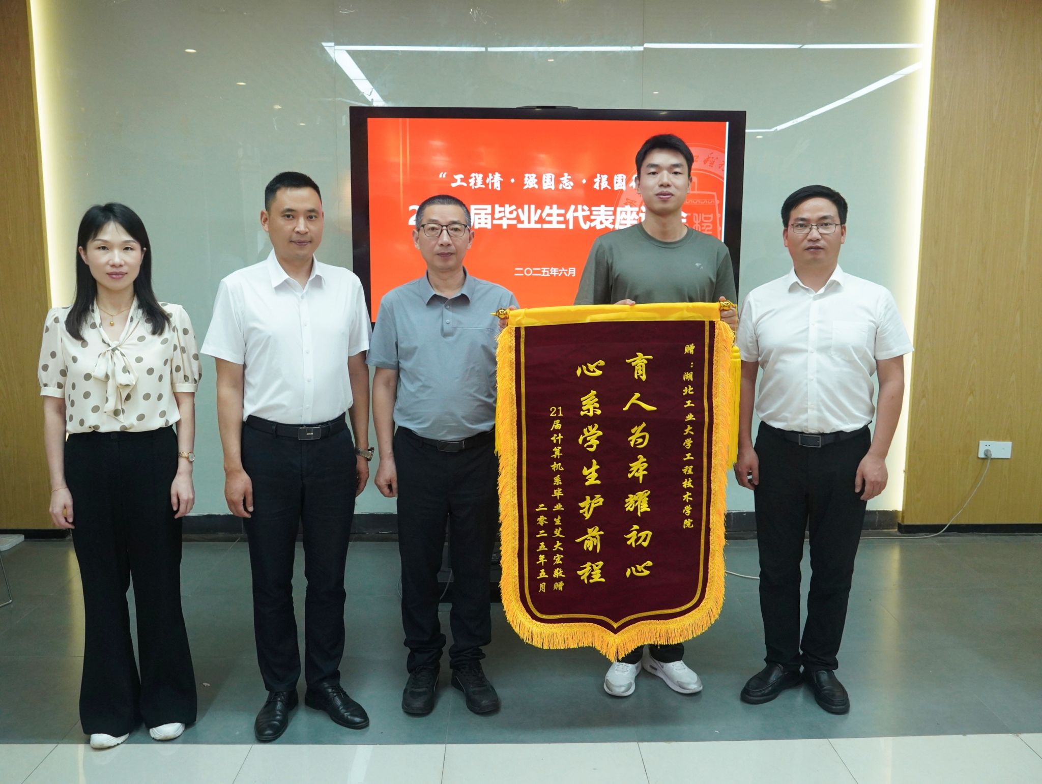 座谈会上,毕业生代表们分享了在学院四年的所思、所感、所悟、所获,表达了面对毕业季的感动与不舍,对学院、老师的悉心培养表示衷心感谢。计算机系毕业生代表艾大宏毕业后即将前往潜江市公安局工作,他分享了自己的求职经验,对学院老师给予他的帮助表达了衷心的感谢,并向学院赠送了锦旗。
