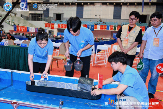 全国大学生结构设计竞赛由教育部高等学校土木工程学科专业指导委员会主办,是国内高校土木工程领域最高级别学科竞赛。本次总决赛共有来自31个省(自治区、直辖市)119所高校的120支队伍参赛。本届赛题以绍兴乌篷船为背景,赛题要求制作的模型需包含船体与船篷:船体须以竹材龙骨与防水膜呈现“中间宽两头窄、上部宽下部窄”的形态;船篷则需满足变形控制与防水铺设要求,旨在考验选手对传统工艺与现代结构力学的融合能力。面对挑战,我院队伍以“上翘船头-无弯折船身-光滑船底”的减阻线型设计,结合“单体船纵横单梁叠置架”体系,在结构稳定性与设计创新性上表现突出,赢得评委高度认可。