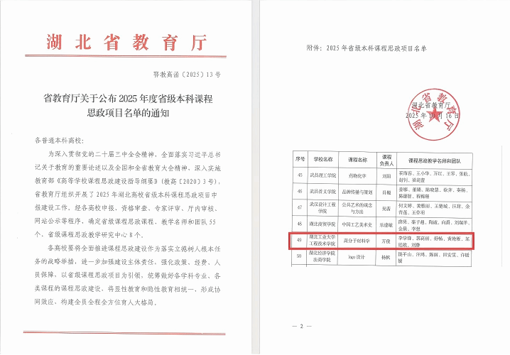 近日,湖北省教育厅发布《省教育厅关于公布2025年度省级本科课程思政项目名单的通知》(鄂教高函〔2025〕13号),学院生化工程系《高分子材料学》课程成功获批省级课程思政示范课程,课程负责人万俊老师及其教学团队同时入选省级课程思政教学名师和教学团队。
