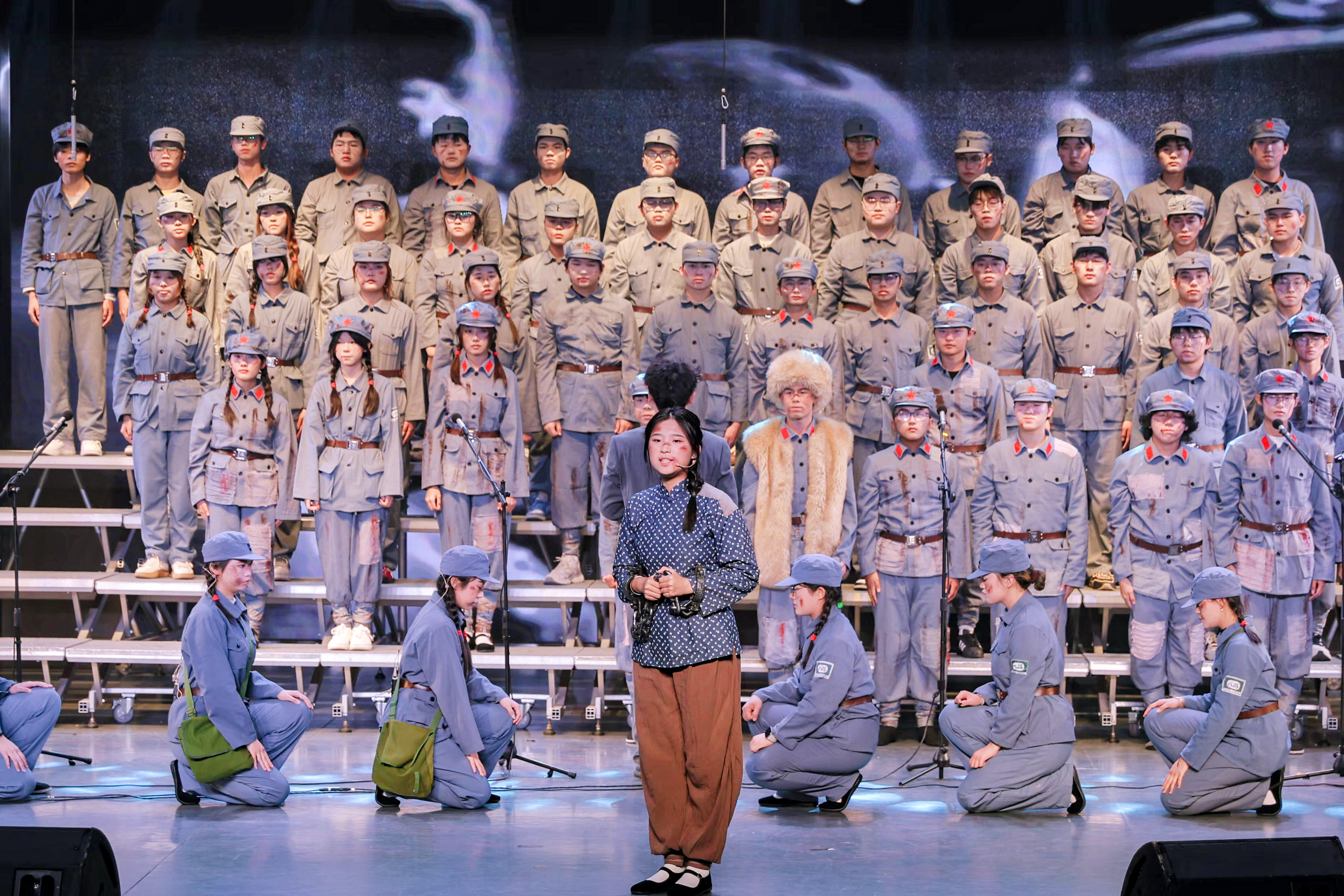 本次活动以“音乐+思政”为主线,创新打造沉浸式红色音乐思政课。整场展演历时90分钟,学院九个系部合唱团及大学生艺术团金石合唱团10支队伍依次登台。近20首镌刻着时代印记的歌曲被重新“解码”——《松花江上》的悲怆呼号,把1931年的山河之殇拉回眼前;《太行山上》的铿锵鼓点,再现“母亲叫儿打东洋”的军民深情;《保卫黄河》多声部层层递进,如惊涛拍岸,卷起游击健儿的冲天豪情;穿插其间的舞蹈《九儿》,以红高粱地里的巾帼剪影,折射个人命运与国家兴亡的同频共振。台上,是青年学子自编自演的沉浸式演绎;台下,是情不自禁的跟唱与泪光。旋律起伏间,一条“从苦难到辉煌”的百年征程悄然铺展。