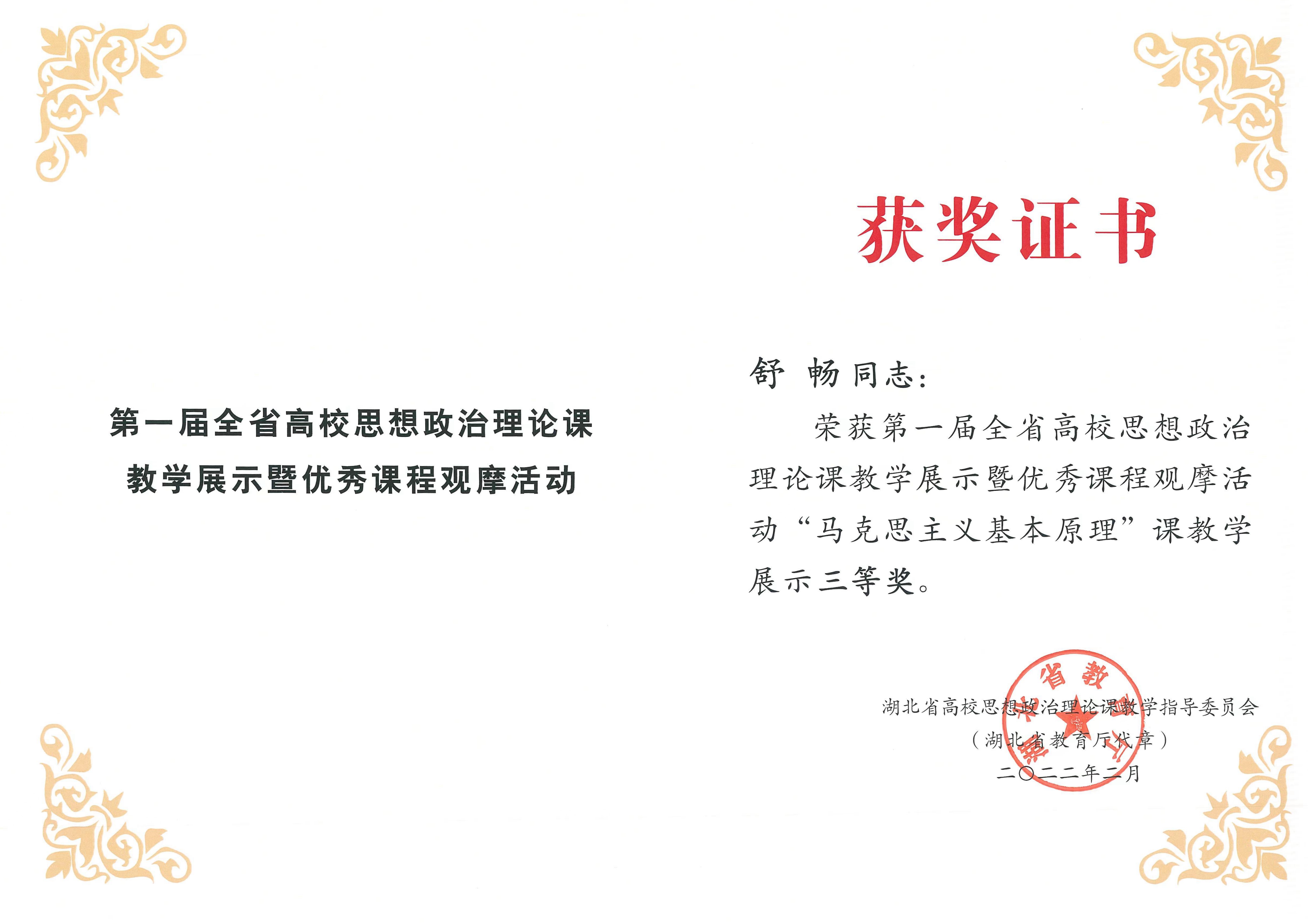舒畅,中共党员,副教授,硕士研究生导师,国家二级心理咨询师,双师型教师。在一线耕耘和探索了13载,她出版独著三部,担任普通高等教育国家“十二五”规划教材《形势与政策》副主编,公开发表教科研论文二十余篇,主持《马克思主义基本原理概论》申报,获批湖北省省级线上线下混合一流课程,主持参与省部级教科研课题二十余项;湖北省“理论热点面对面”调研活动中获评“优秀调研报告”。