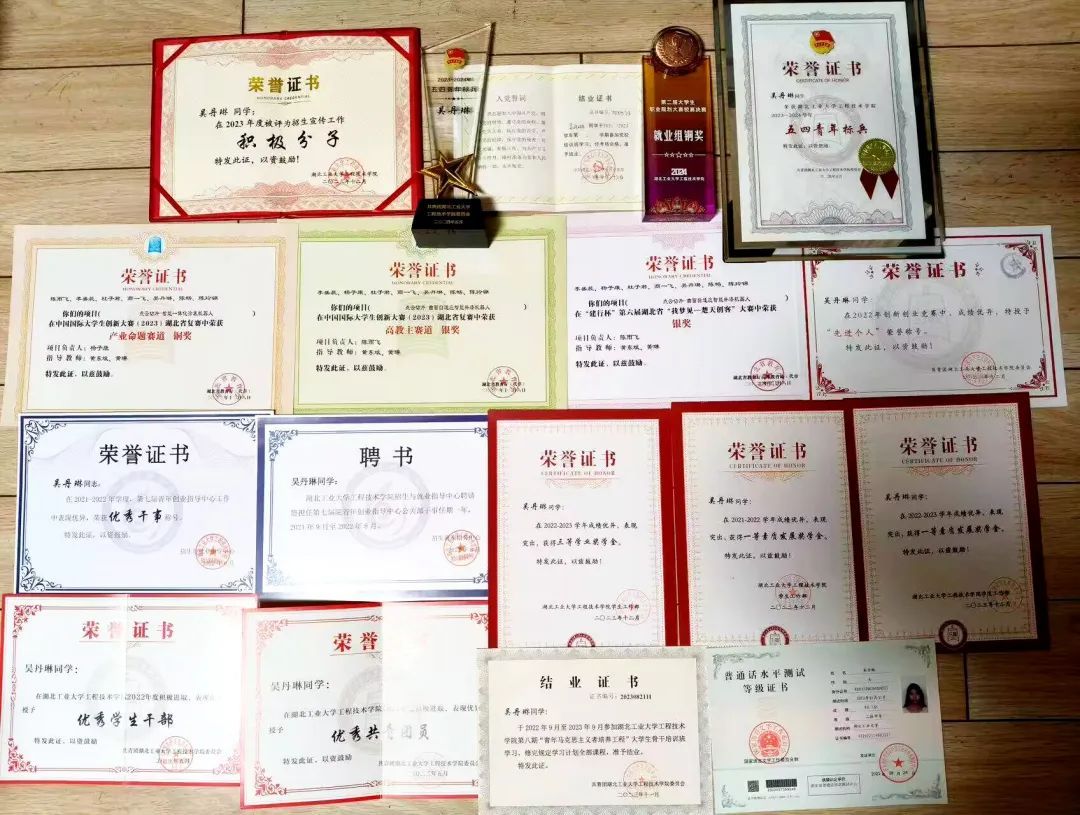 在校期间,她专业成绩名列前茅,专业排名第二,24门课程达到90分以上,连续三年荣获学业奖学金;在科创竞赛中表现卓越,参与的“互联网 +”赛事智能补漆机器人项目屡获佳绩,从院赛金奖到省赛银奖、铜奖,成果斐然;同时,她还积极投身学生工作,担任院青年创业指导中心负责人,在平衡学业与工作的过程中不断成长。